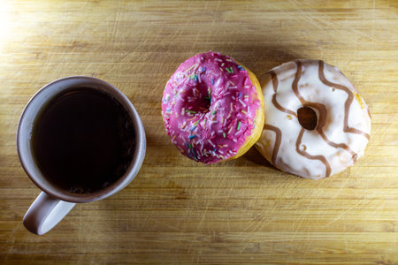 A delightful morning treat with coffee and colorful donuts on a wooden surface