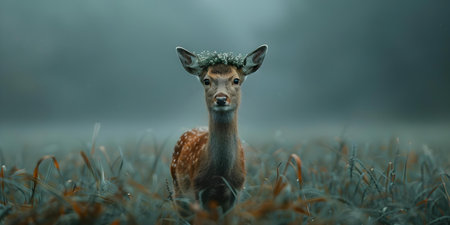 A tranquil deer adorned with a leaf crown in a misty meadow. Concept Nature Photography, Wildlife Portraits, Forest Aesthetics, Animal Kingdom, Enchanted Moments