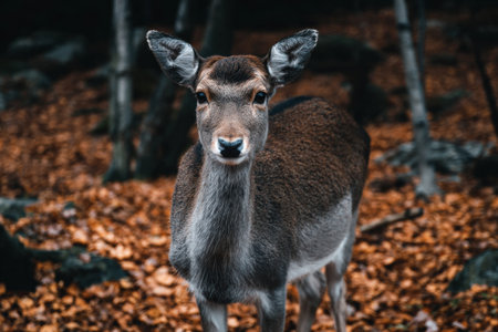 A deer calmly stands among fallen leaves in a peaceful forest, showing the beauty of nature during autumn.