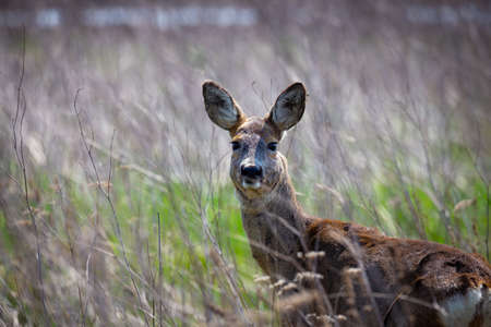 Roe deer hiding in the tall grass. Made on a sunny day. Spring season