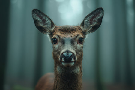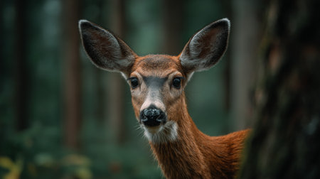 A captivating close-up image of a young deer, showcasing its curious expression and intricate details, captured in a serene forest setting.