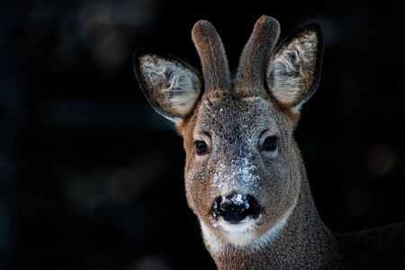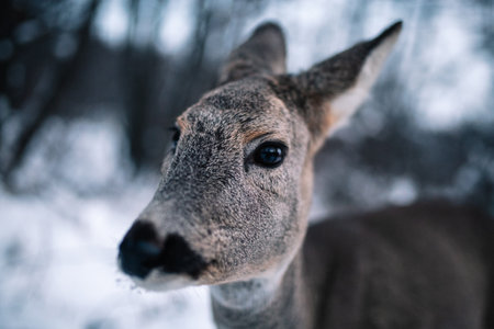 Portrait of a roe deer in the winter forest. Selective focus.