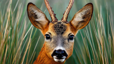 , centered portrait of a small male deer, likely a roe deer, peering forward through dense, tall, vertical blades of green grass or reeds, featuring its prominent ears and small developing antlers.