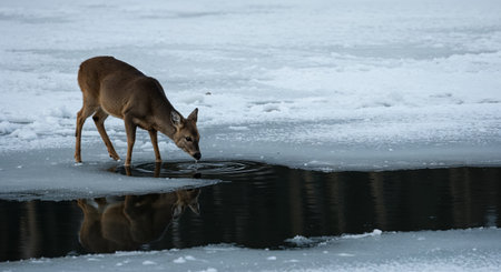 A graceful wild cervid lowers its head to drink from the dark, open water of a partially frozen lake, with a clear reflection beneath it and a vast expanse of white ice.