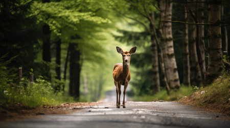 wild deer crossing a secluded forest cycling trail, created with generative ai