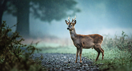 Roe deer on the road in foggy forest. Nature composition.