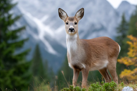This charming deer stands alert in her natural habitat, surrounded by the lush greenery of the forest during autumn.