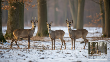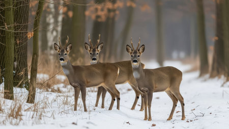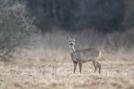 Roe deer in forest, Capreolus capreolus. Wild roe deer in winter nature.