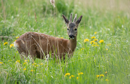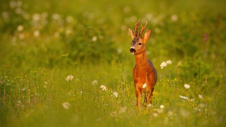 Roe deer, capreolus capreolus, buck in summer at sunset on meadow with flowers. Wild animal in nature. Horizontal panorama composition of mammal with space for copy