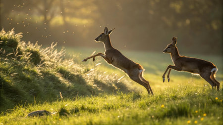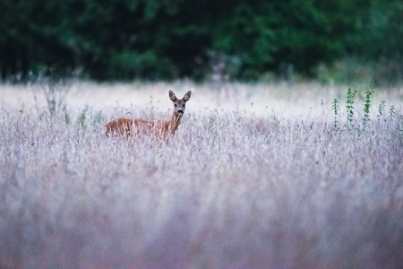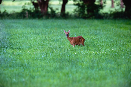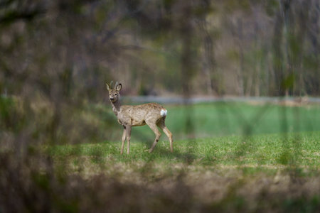 A young wild roe deer (Capreolus), frightened, escapes across the field towards the forest. The animal jumps high to quickly escape to a safe place.