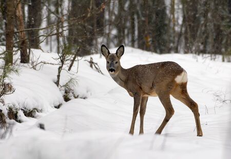 Female Roe deer gives a head turn towards camera in winter snowy forest