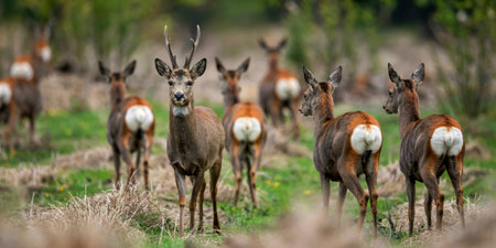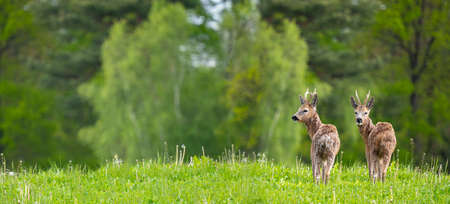 Roe deer, capreolus capreolus, buck in spring at sunset. Morning wildlife scenery from nature. Alerted wild deer with blurred background. Panaromatic composition of deer with clear green blurred background.