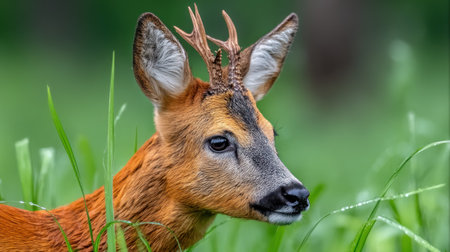 Portrait of a young male roe deer, identifiable by its small, developing antlers covered in velvet, partially concealed by vibrant green stalks of grass, suggesting a damp, lush environment.