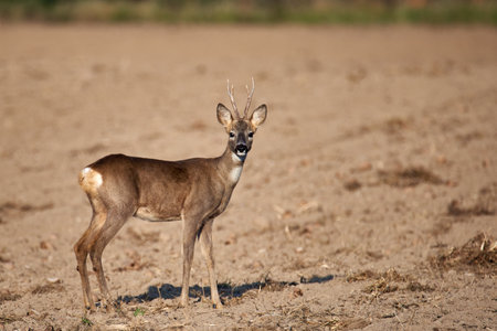 Roe deer (Capreolus capreolus) looking for food. Lit by sunlight. Walking in agricultural field.