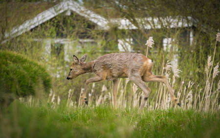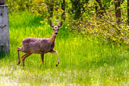 Oberriet Switzerland, April 28, 2021 Wild young deer is running over a green field