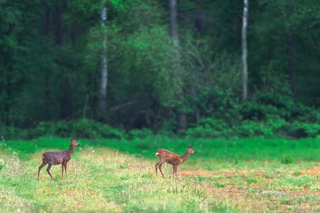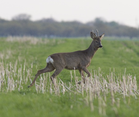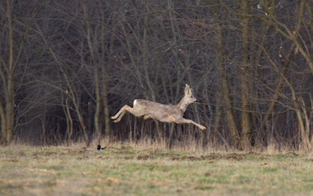 A young wild roe deer (Capreolus), frightened, escapes across the field towards the forest. The animal jumps high to quickly escape to a safe place.