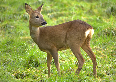 Doe female in grass. Wild animal in Polish Bieszczady Mountains