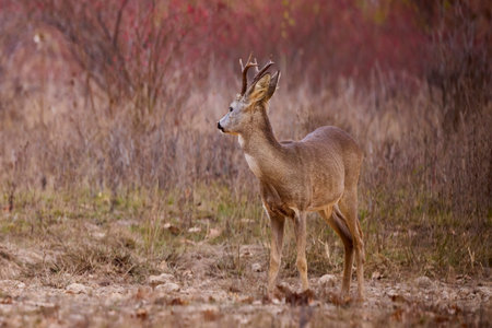 Roe deer (Capreolus capreolus) looking for food. Lit by sunlight. Walking in agricultural field.