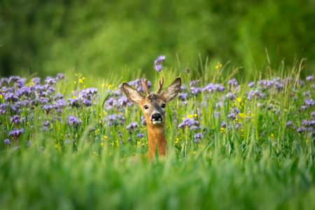 Roe deer in flowers in a meadow, spring day, eastern Poland