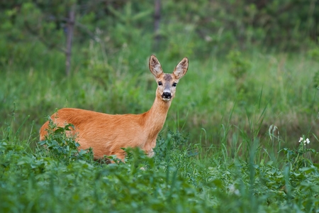 Roe Deer, Capreolus capreolus, Doe in green meadow. Wild animal in summer in fresh green environment. Wildlife scenery with blurred background.