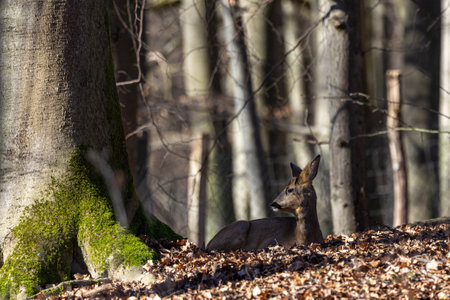 A Roe Deer - Capreolus Capreolus - lying and relaxing in the autumnal forest