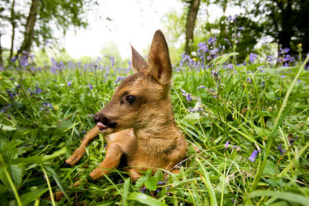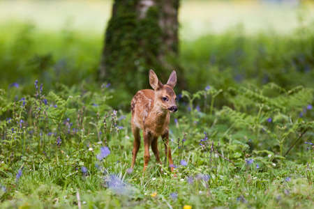 Young wild roe deer in grass, Capreolus capreolus. New born roe deer, wild spring nature.