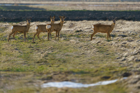 A group of deer wandering through early spring meadows in search of fresh grass.
