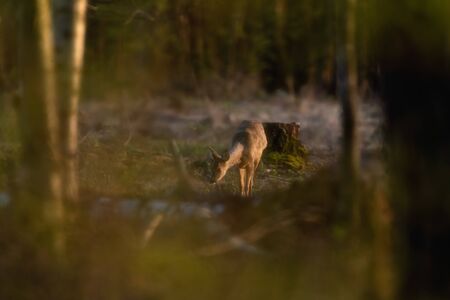 Roe deer, capreolus capreolus, doe walking through a forest at sunset. Wildlife scenery form woods.