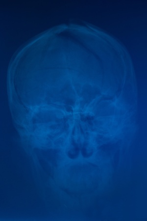 A detailed x-ray image of a human skull against a blue background, showcasing the intricate bone structure and anatomy for educational and medical purposes.