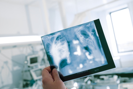 X-ray picture of a lung doctor holds a hand in a medical glove on a light background