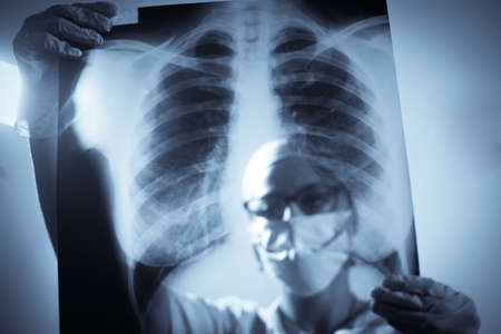 Conceptual image of a doctor holding and analyzing an x-ray of some lungs.