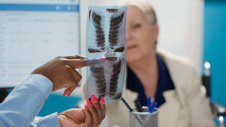 Woman physician reading x ray diagnostics for a patient in medical office, doing a test results scan interpretation to help person with disease. Providing treatment and advice for recovery.