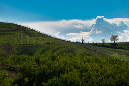 Rural view on green hills, meadows and vineyards in spring in Piedmont, Northern Italy.