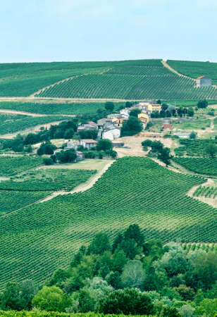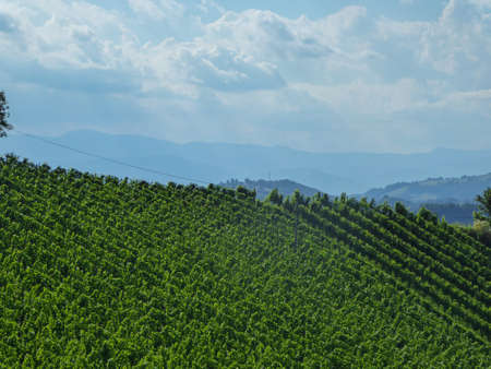 Rural landscape at summertime along the road from Vicobarone (Piacenza, Emilia Romagna, Italy) to Santa Maria della Versa (Pavia, Lombardy), in the Tidone valley. Vineyards.