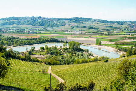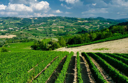 Rural landscape of vineyards at springtime in Langhe, Cuneo province, Piedmont, Italy