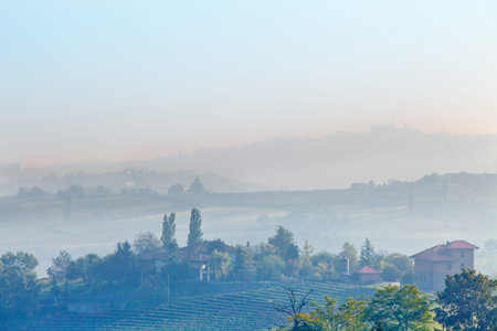 View over the vineyards in the hills of the Langhe in Piedmont Italy illuminated by the warm light of the setting sun, with backlighting