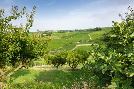 Hills with vineyards and plants of fruits in Italy (Calosso, Asti, Piedmont)