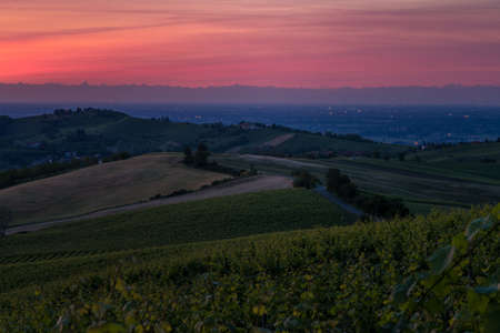 Amazing red sunset over Oltrepo Pavese hills with wineyards and country roads