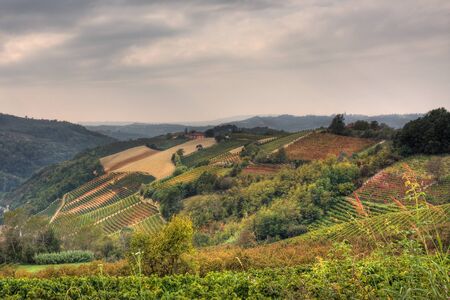 View on hills and vineyards at fall in Piedmont, Northern Italy.