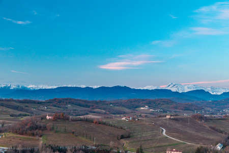 Panoramic view on hills and villages against mountains at sunset in Piedmont, Northern Italy.