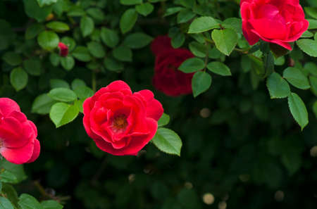 Red roses with buds on a background of a green bush. Bush of red roses is blooming in the summer.