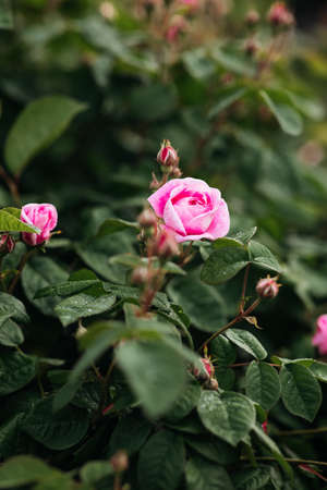 Bush with pink rose flowers on a background of emerald foliage, flowering,