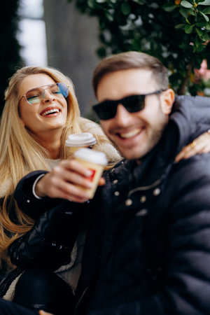 Carefree Couple Laughing by Water at Twilight with Warm Ambient Glow