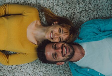 Young couple spending time together at home. Man and woman lying down on the carpet and having fun.