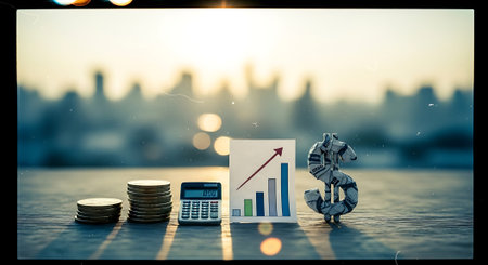 A stack of coins, a calculator, and a dollar sign figure on a reflective surface with a cityscape and bar graph in the background.