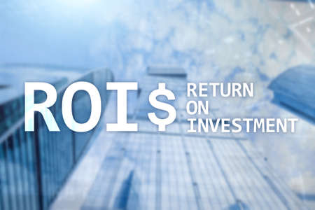 ROI - Return on investment. Stock trading and financial growth concept on blurred business center background.