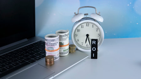 Return On Investment Concept. Financing and Investment Concept. Selective focus on the watch with money and coin.