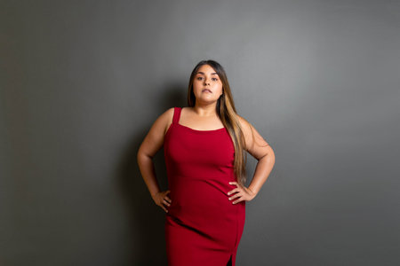 Happy plus size fashion model in red blouse on green background, body positive concept