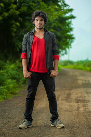 Portrait of smiling young Indian man in red hoodie, looking at camera, posing against blue studio background