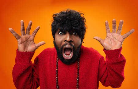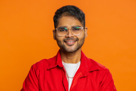 Cheerful lovely happy young Indian man smiling friendly glad expression looking at camera dreaming resting relaxation feel satisfied good news. Arabian Hindu guy isolated on orange studio background